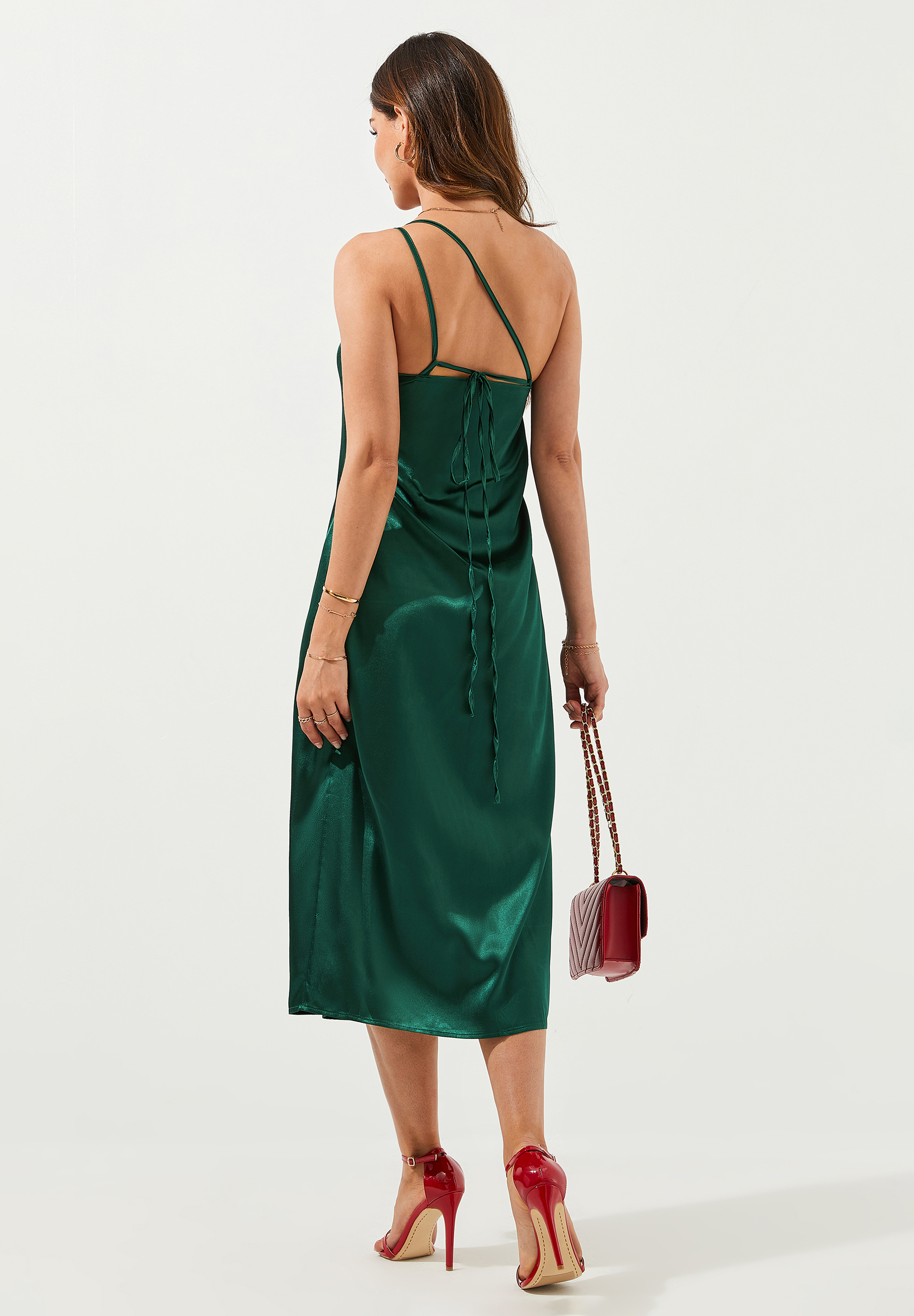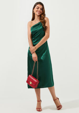 This elegant one-shoulder midi dress with an asymmetrical cut is the epitome of modern style and sophistication. Its unique one-shoulder design adds a sensual touch, highlighting the shoulders and neckline, while the asymmetrical hem gives it a dynamic look. Perfect for special occasions, this dress accentuates the confidence and unique style of the woman wearing it.